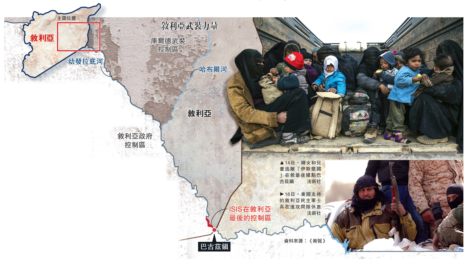 【大公報訊】據路透社、法新社報道:極端組織「伊斯蘭國」(ISIS)在盟軍的攻勢下在敘利亞與伊拉克節節敗退,目前只剩下敘伊兩國邊境上一小塊領地,料將很快被殲滅。美國總統特朗普16日表示要求英法德等歐洲國家接收並審判在敘利亞被捕的800多名本國極端武裝分子,但此舉將在歐洲引發恐怖主義蔓延的風險。