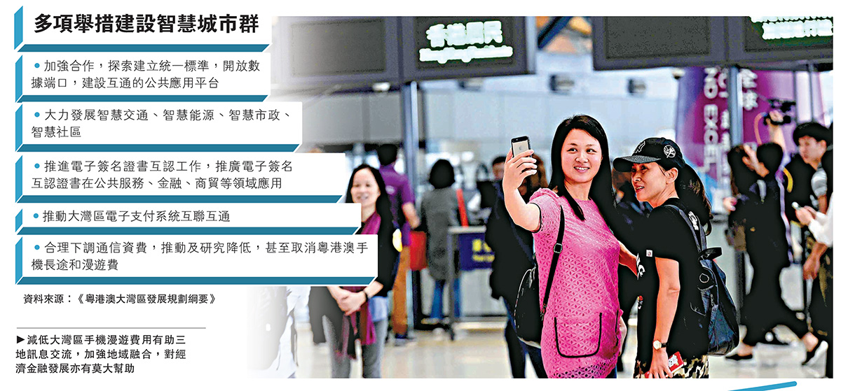 《粵港澳大灣區發展規劃綱要》指出,為建設大灣區智慧城市群,三地政府會積極商討降低大灣區手機長途及漫遊費,更將開展豁免大灣區手機長途及漫遊費用的可行性研究,為智慧城市建設提供基礎支撐。市場學者指出,減低大灣區漫遊費用有助三地訊息交流,加強地域融合,對營商有莫大幫助。電訊商中國移動香港更早於2017年率先取消數據漫遊費,實現三地數據共享,方便港人。/大公報記者 劉 心