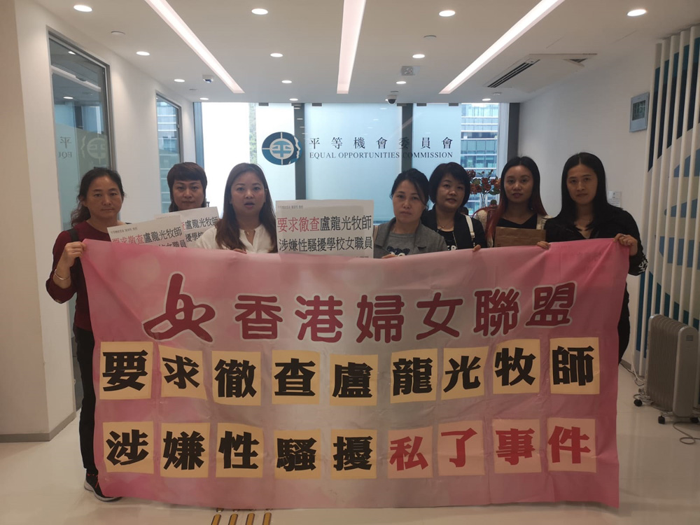 【大公報訊】記者賴依婷報道:香港婦女聯盟關注組成員昨到平等機會委員會請願,要求平機會徹查盧龍光牧師涉嫌性騷擾學校女職員事件,並希望平機會就性騷擾行為促政府進行刑事立法工作。
