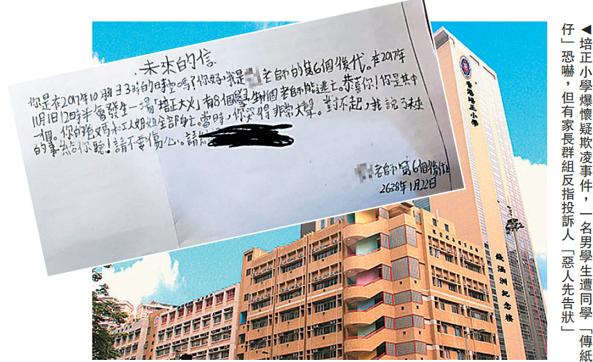 傳統名校培正小學懷疑校園欺凌,事件網上廣泛流傳後爆出羅生門。有家長發出一則帖文,聲稱培正一名小四男學生遭同學多次「傳紙仔」恐嚇,內容包括「你的爸媽和工人姐姐全部身亡」,並遭對方兩度襲擊,據稱校方拒絕受理,該名學生其後疑因精神崩潰被迫轉校。不過,培正家長群組及後道出另一版本,反指被欺凌的小四生「出手打人」,批評家長「惡人先告狀」。教育局已收到投訴並會跟進,發言人強調對校園欺凌「零容忍」。/大公報記者 趙凱瑩