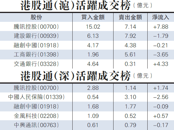 藍籌股中,除了騰訊獲北水追貨外,昨日逆市下跌的吉利汽車(00175)亦有較多北水流入,全日約有4.79億元淨流入,當中經港股通(滬)淨流入近3.9億元,港股通(深)約9000萬元。至於中資金融股,創一年新高的交行(03328),亦有4.33億元淨流入,另一內銀股中行(03988)則有1.81億元淨流入。而油價偏軟,亦無助資金流向油股,中海油(00883)有2.21億元淨流入。