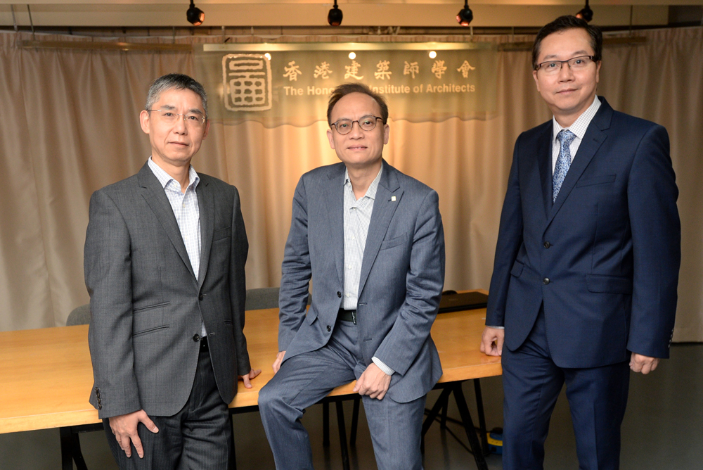 圖:(左起)香港建築師學會會長李國興、內地事務部主席劉錦勝及副主席譚國治暢談香港建築師在大灣區發展的限制與機遇\大公報記者 林良堅攝