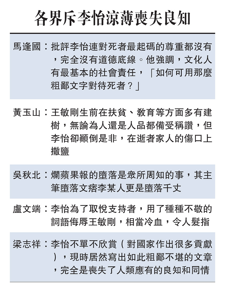 【大公報訊】記者高仁北京報道:港區全國人大代表王敏剛日前因病逝世,《蘋果日報》專欄作家李怡竟撰文「抽死人水」,不僅一再貶低對方,甚至用低俗至極的字眼來給逝者起「花名」,引起仍在北京出席全國兩會的港區全國人大代表團全體成員的無比憤慨。代表團團長馬逢國怒斥李怡不但不具備文化人最基本的社會責任感,更失去一個正常人所應有的道德底線。本港各界亦斥李怡冷血、涼薄,喪失了人類應有的良知和同情,要求他必須道歉。