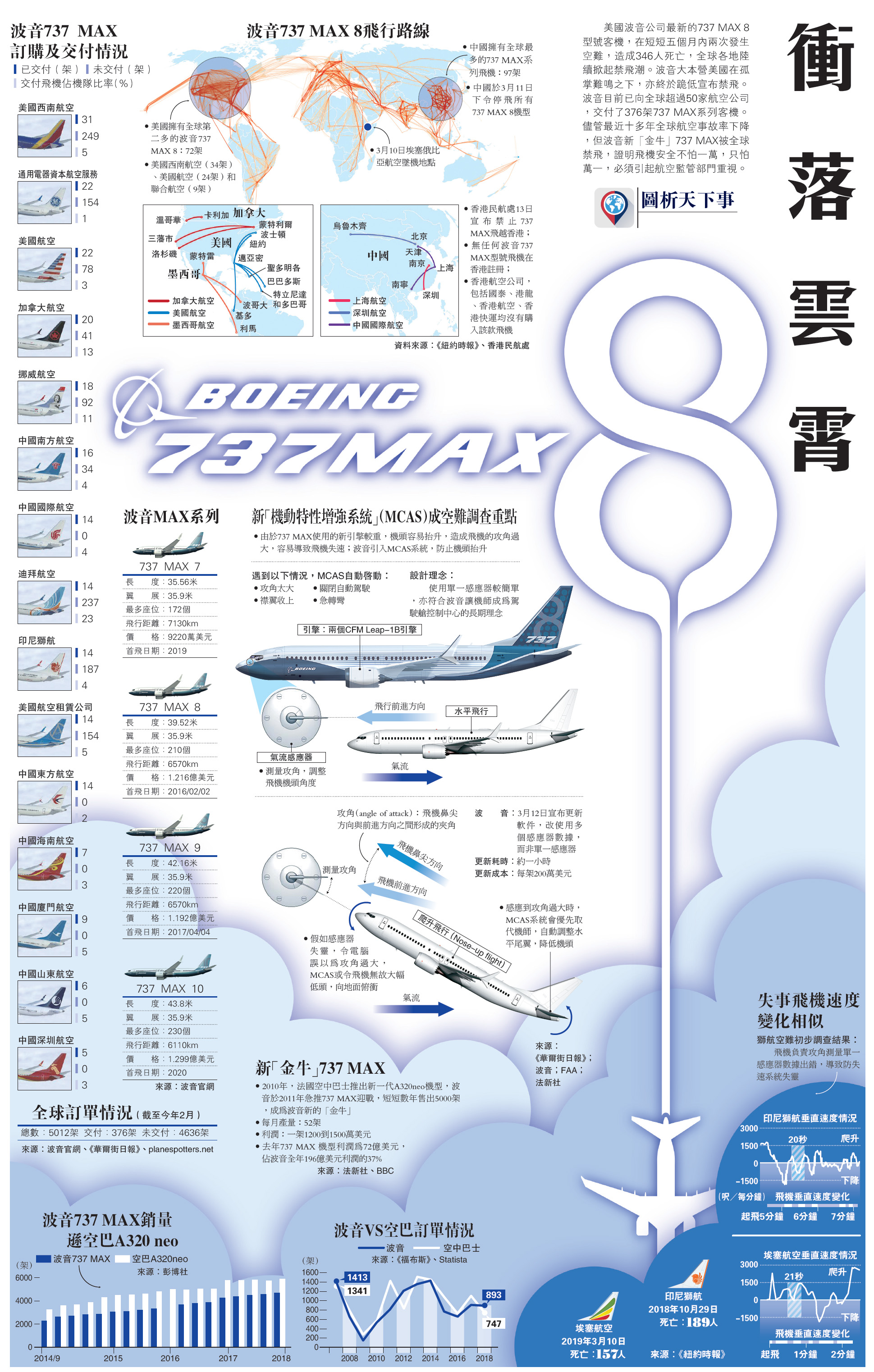 美國波音公司最新的737 MAX 8型號客機,在短短五個月內兩次發生空難,造成346人死亡,全球各地陸續掀起禁飛潮。波音大本營美國在孤掌難鳴之下,亦終於跪低宣布禁飛。波音目前已向全球超過50家航空公司,交付了376架737 MAX系列客機。儘管最近十多年全球航空事故率下降,但波音新「金牛」737 MAX被全球禁飛,證明飛機安全不怕一萬,只怕萬一,必須引起航空監管部門重視。