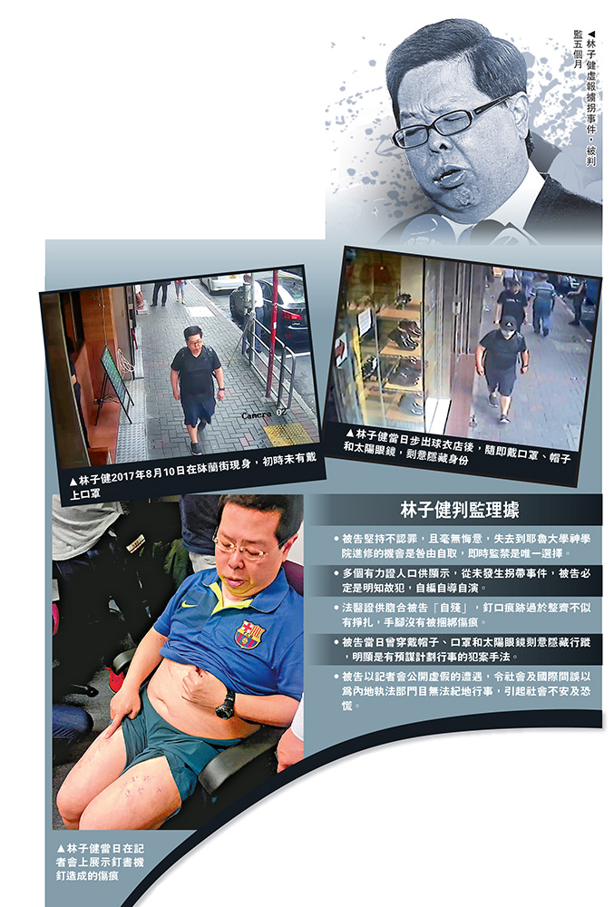 民主黨成員林子健前年高調報稱在旺角砵蘭街被疑似國安人員擄走,其後被警方發現虛報案件。西九龍裁判法院昨裁定林子健「明知地向警員虛報有人犯罪」罪成,即時監禁五個月,林獲准申請保釋上訴。裁判官直斥被告毫無悔意,有計劃地「自編自導自演」預謀犯事,又斥被告召開記者會公開虛假遭遇,令香港及國際社會誤以為內地執法部門目無法紀地行事,惹起不必要恐慌,為調查案件更虛耗了大量警力,即時監禁是唯一選擇。/大公報記者 周峻峯報道