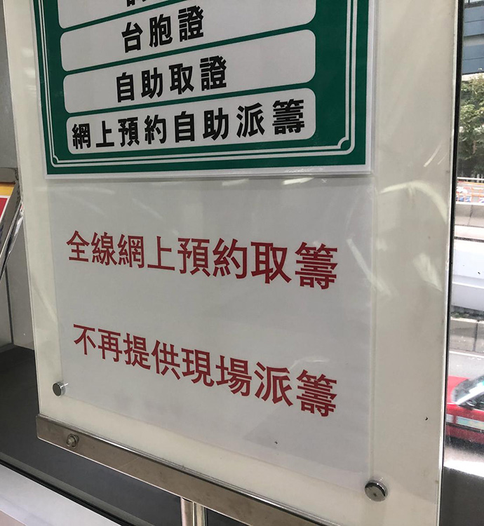 大公報記者昨日到中旅社證件服務中心實地觀察,現場已有告示列明「全線網上預約取籌,不再提供現場派籌」(見圖),而輪候辦證的市民不多,秩序良好。市民鄧先生表示,以往換證需刻意請假,趕及早上到中旅社領籌兼等候多時。現時經網上申請較快捷,十多分鐘便完成預約。