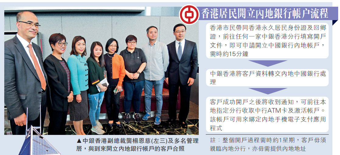 港人如要開立內地銀行帳戶,往往要親身前往內地網點辦理,且過程頗為耗時。中銀香港昨日推出的服務相對簡便:香港市民(須為中銀香港客戶)只需攜同香港永久居民身份證和回鄉證,毋須提供內地地址,亦毋須親臨內地分行。前往中銀香港任何一間分行填寫申請開戶文件,即可提交申請;中銀香港會將資料轉交內地的中國銀行(03988)審批,成功開戶之後,客戶可前往本地指定中銀香港分行領取通知書和中行ATM卡,激活帳戶之後即可開始使用。整個過程需時約為一星期。