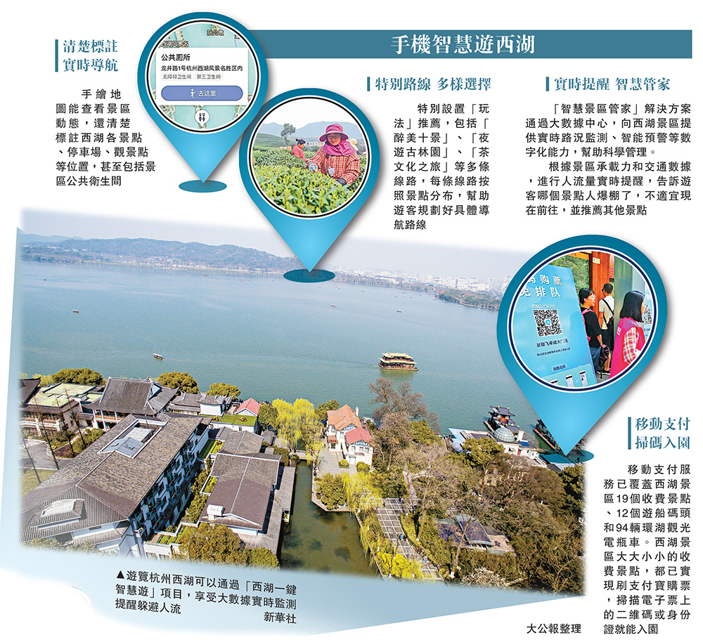 遊覽杭州西湖添加新「玩法」,「一張地圖玩轉西湖」有望成為現實。19日,「西湖一鍵智慧遊」手機App項目正式上線。據悉,該項目基於數字化功能,全部覆蓋景區近60平方公里區域,為遊客提供景區設施精準標註、多樣推薦路線及實時監測路況及景點人流的服務。目前,杭州西湖成為中國面積最大的「數字景區」。/大公報記者 王莉