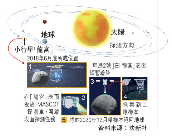 今年2月22日,隼鳥2號首次短暫登陸「龍宮」,發射了一顆小型金屬球撞擊「龍宮」使其地表物質飛散,按計劃採集樣本後又飛回到離小行星表面約20公里處的待機地點。