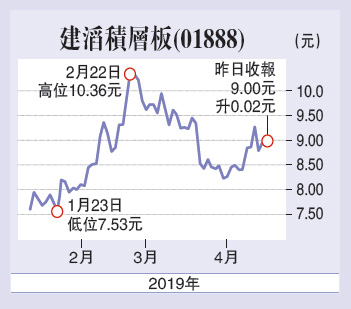 建滔積層板股價自年初急升後,2月見頂回落,業績後跌勢加劇,近日在5G概念重燃下開始反彈。預期反彈可以持續下,可於現價買入,目標10.5元,跌破8.2元止蝕。