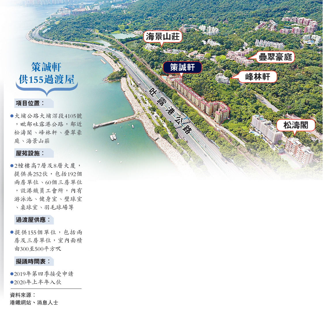 消息透露,房屋協會與港鐵公司正在商討,擬將港鐵大埔吐露港員工宿舍「策誠軒」交與房協,預料可於未來五年提供約155個過渡性房屋單位。今次是港鐵首次參與提供過渡性房屋,「策誠軒」位置背山面海,與豪宅為鄰,單位面積300至500平方呎,推算估計月租2100至4000元,堪稱「筍價」,預計最快今年第四季接受申請,明年上半年入伙。/大公報記者 曾敏捷
