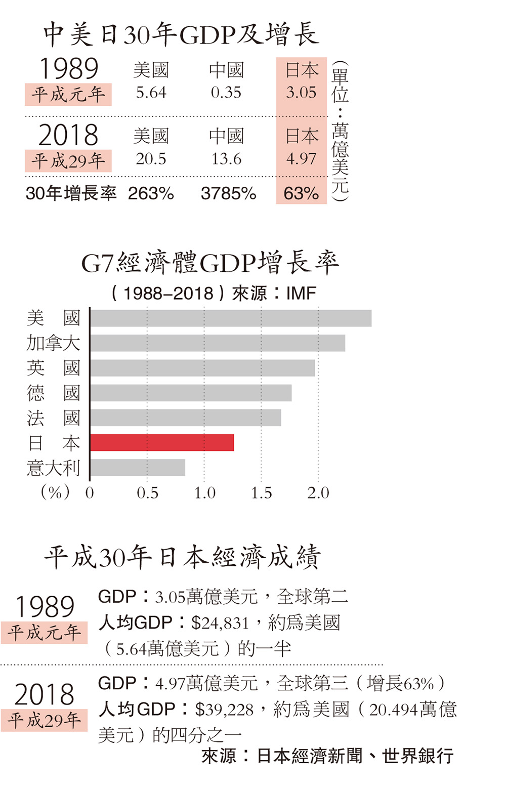 日本泡沫經濟在平成元年達至頂峰,股市升至歷史最高位,翌年泡沫破裂,經濟陷入低迷,民眾經歷「就職冰河期」,一九九七年亞洲金融危機,日本銀行業破產,二○一一年日本由第二大經濟體降至第三。日本央行從一九九九年起實施零利率,依然難盤活經濟。安倍晉三再次上台推出「安倍經濟學」,就是希望擺脫通縮與泡沫。