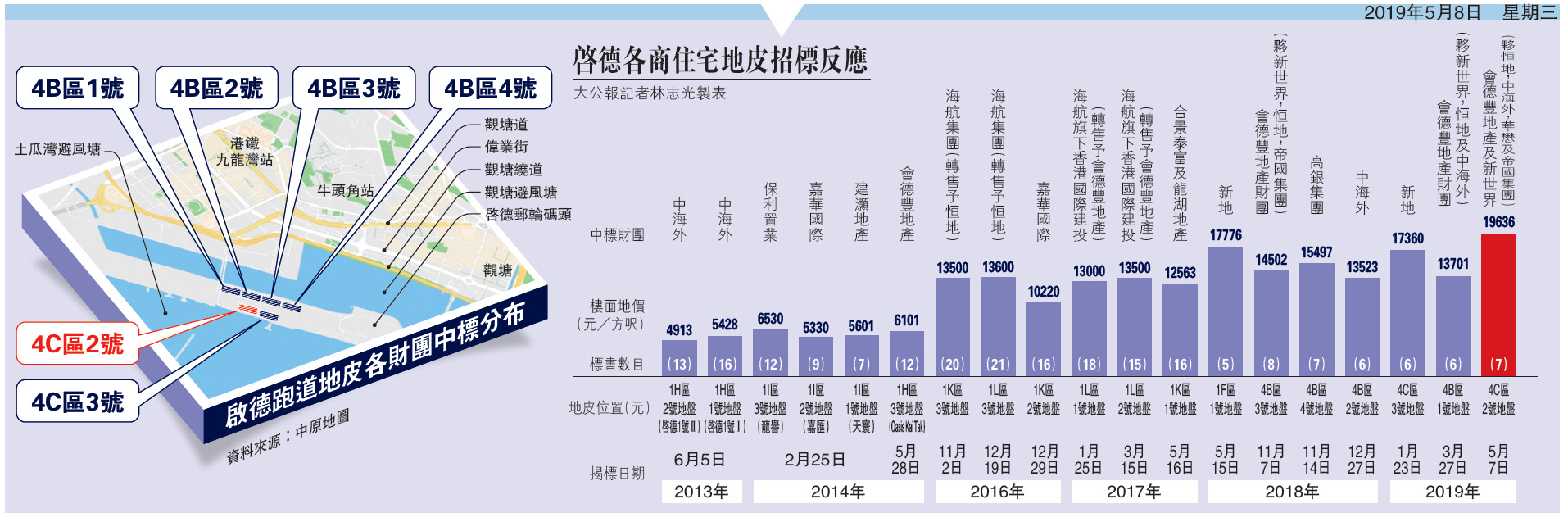 今次地皮的成交價,位列全港住宅地最高價的第三位,僅次於長沙灣興華街西的近173億元及鴨脷洲利南道地逾168億元,較市場預期高限約115億元,多近一成。以地皮總可建樓面64.12萬方呎計,每呎樓面地價約19636元,暫成啟德區的新高價,亦高於新地(00016)今年一月所投得的毗鄰4C區3號地的每呎地價17360元,四個月內升值13.11%。