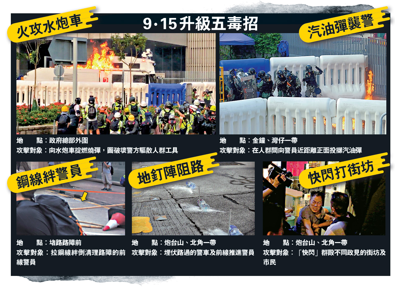 記者綜合前天暴徒所用「毒招」,發現不斷升級,已達恐怖分子級數。如在灣仔天樂里設置「地釘陣」,即在馬路上垂直安裝一支支約一呎長的鐵釘,有市民直斥非常陰濕,一旦「拮爆」車胎或有人不慎跌倒被插,後果不堪設想。另有暴徒在堵路路障前設鋼線,及有組織地向水炮車及警員等近距離投擲汽油彈。