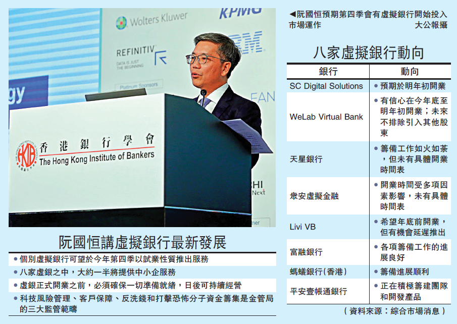 香港金融管理局在今年3月底至5月初期間,先後發出八張虛擬銀行牌照。金管局副總裁阮國恒表示,部分虛擬銀行可望於今年第四季以試業性質(soft launch)陸續推出服務。在八家虛銀之中,大約一半可於開業後不久為中小企提供服務。