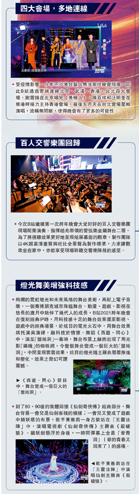 •受疫情影響,今年不少港台藝人無法前往晚會現場,因此B站通過雲端連線北京、武漢、香港、台北四大會場,謝霆鋒在北京唱完《黃種人》,陳百祥和汪明荃在維港畔接力主持香港會場,最後五月天在台北會場壓軸演唱,流暢無間斷,使得晚會有了更多的可能性。