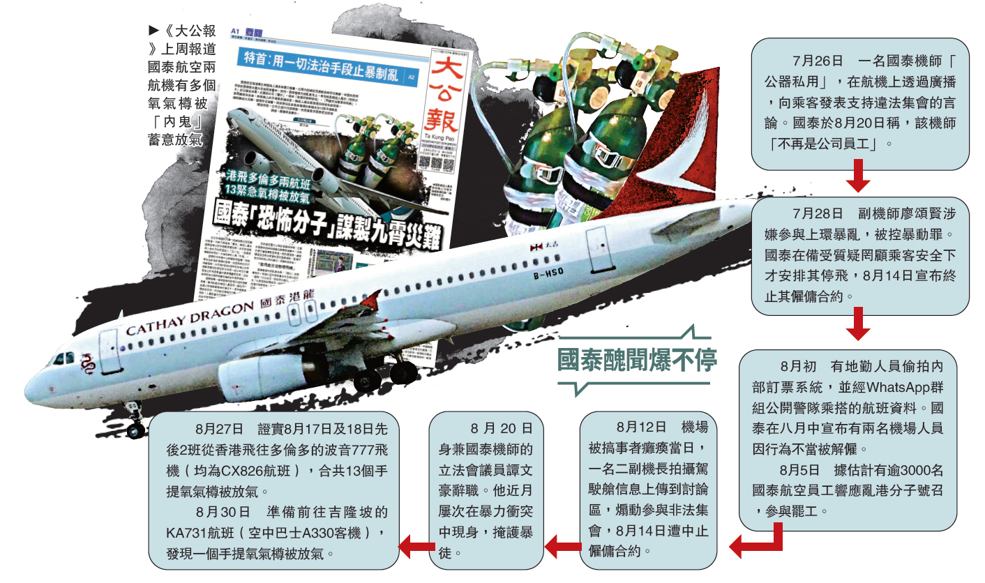 國泰航空接連爆出有機組人員參與暴力衝擊、公開內部資訊及煽動參與非法集會,中國民航局早前對國泰發出重大安全風險警示。然而,國泰整頓內部亂象未止,曾有相信是機組人員在網上揚言,要與公司「攬炒」、「拖慢所有嘢嚟做」、「用盡方法整壞啲飛機」。國泰早前表示,每架客機均設有22個手提氧氣樽,專供執勤的機組人員使用,讓他們一旦遇上飛機氣壓急降的情況下,憑手提氧氣樽協助呼吸,依然能在機艙內行動。