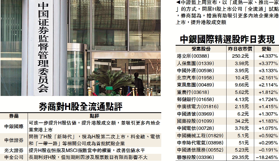 為進一步優化境內企業境外上市融資環境,深化境外上市制度改革,中證監上周末宣布,以「成熟一家、推出一家」的方式,開展H股上市公司「全流通」試點,試點企業不超過3家。多家券商將上述政策視為利好信號,對港股中長期影響正面。中銀國際認為,措施有助推進國企改革和人民幣國際化,有助提升港股成交額,並吸引更多內地企業來港上市。而中信證券則認為是開啟H股的「新時代」,預計金融、電信和「一帶一路」等相關公司最有機會成為首批試點企業。/大公報記者 林靜文