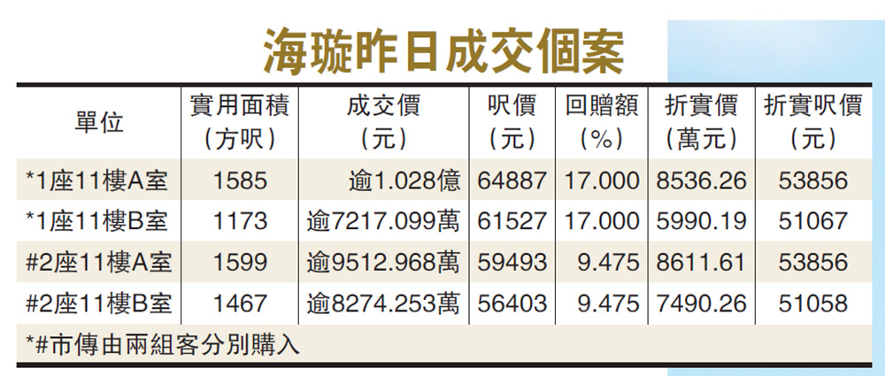 北角海璇去年底打破成交裂口後,昨日連環沽四伙兼再錄新高價。海璇成交紀錄冊顯示,其中一座11樓A室及B室兩伙,實用面積1585方呎及1173方呎,成交價1.028億元及7217.0995萬元,呎價高見64887元及61527元,連環破港島東分層新高,有指兩伙由一組買家買入,涉資逾1.7億元。