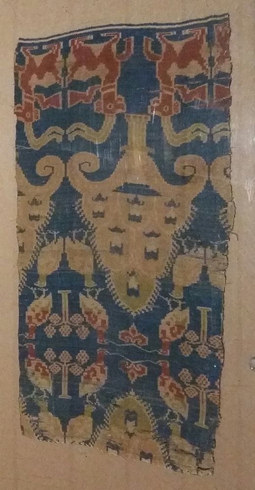 看「綿亙萬里——世界遺產絲綢之路」展覽,兩塊出土織錦:一塊「胡王錦」,另一塊「藍地對雞對羊燈樹紋錦」,已是上千年前的殘件,於今看來,仍然驚為天人,簡直是珍品中的珍品,令人好生感動。筆者當天獨自往參觀,也來參觀的兩位女士,與我合共三人,彼此互不相識,卻不約而同,凝神細看這兩塊織物,之後不期然為此滔滔暢談,交流意見,很有意思。