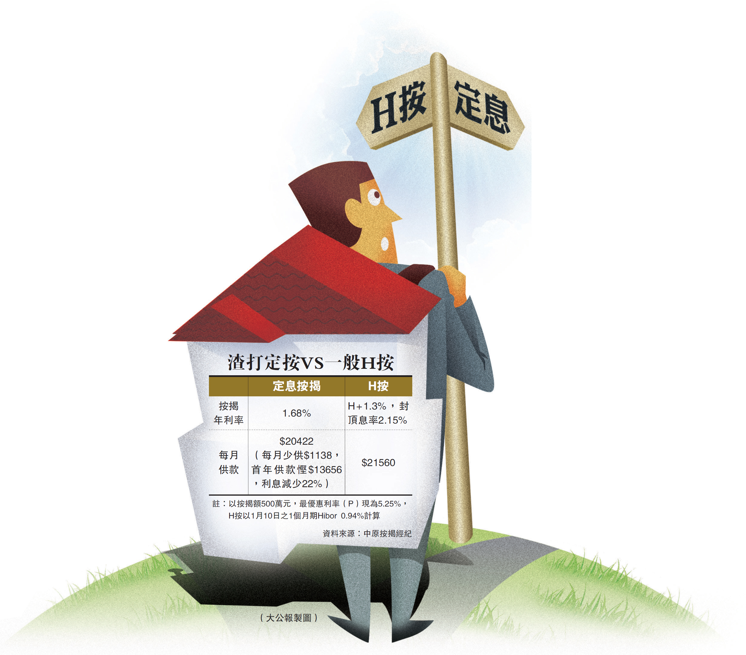 長和主席李嘉誠及不少財金界人士均預期,本港銀行今年很大機會開始加P,而定息按揭計劃正好令置業人士有供樓預算,而銀行亦可藉此吸納新客,可謂雙贏策略。以按揭金額500萬元,還款期為25年計算,按渣打提供的低定息按揭計劃,首年1.68%定息的每月供款約為20422元。若選用一般H按計劃,封頂息率為2.25%(H+1.3%),每月供款為21560元。兩相對比,前者12個月共可慳息13656元或22%。