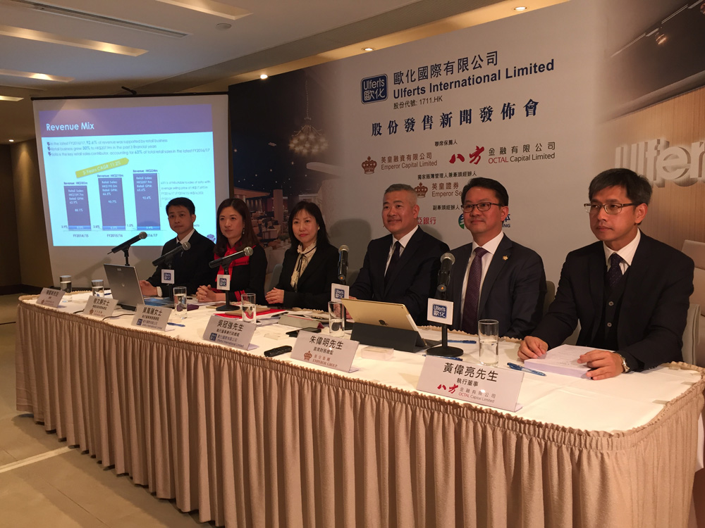 圖:歐化國際營運總監莫鳳蓮(左三)、行政總裁吳冠強(右三)、英皇集團首席財務總監朱偉明(右二)、投資者關係總監陸文靜(左二)、英皇融資董事陳耀南(左一)、八方金融執董黃偉亮(右一)/大公報攝