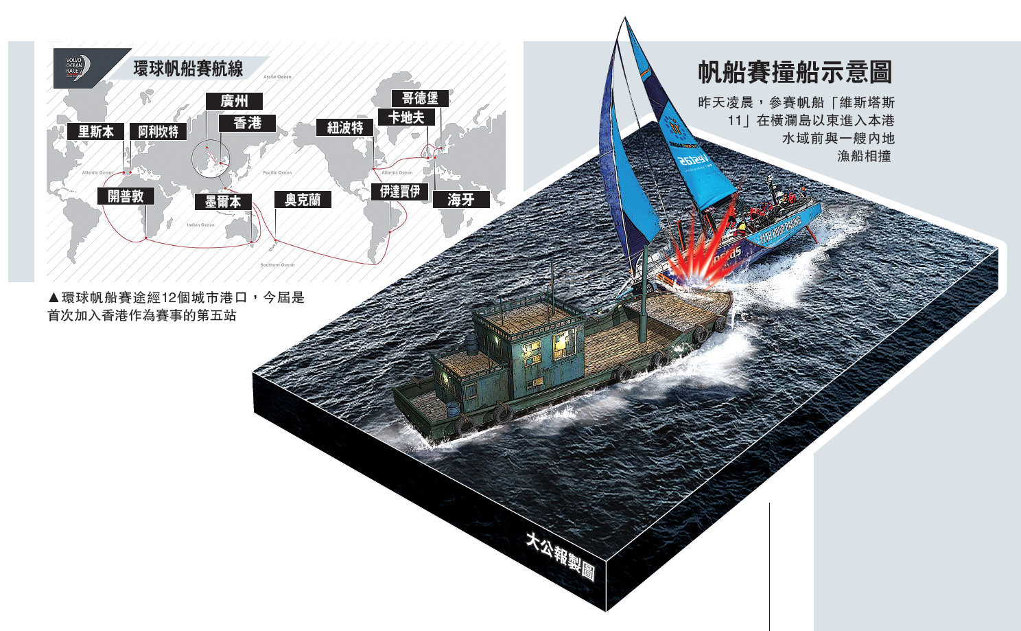 帆船賽中的盛事,環球帆船賽(Volvo Ocean Race)首次以香港作分站比賽,但在昨天凌晨卻發生致命事故。參賽帆船「維斯塔斯11」(VESTAS 11),在橫瀾島以東進入本港水域前與一艘內地漁船相撞,帆船船頭嚴重受損,船上無人受傷,但內地漁船迅即沉沒,漁船上十人墮海,船主一度失蹤,獲救時已昏迷,本港政府飛行服務隊派出直機將事主送院,惜他搶救至清晨終告不治。當局正對意外原因展開調查,本港水警重案組亦跟進事件,主辦當局代表Volvo Ocean Race和VESTAS 11競賽隊,對遇難者家屬表示沉痛哀悼。/大公報記者 張 琦