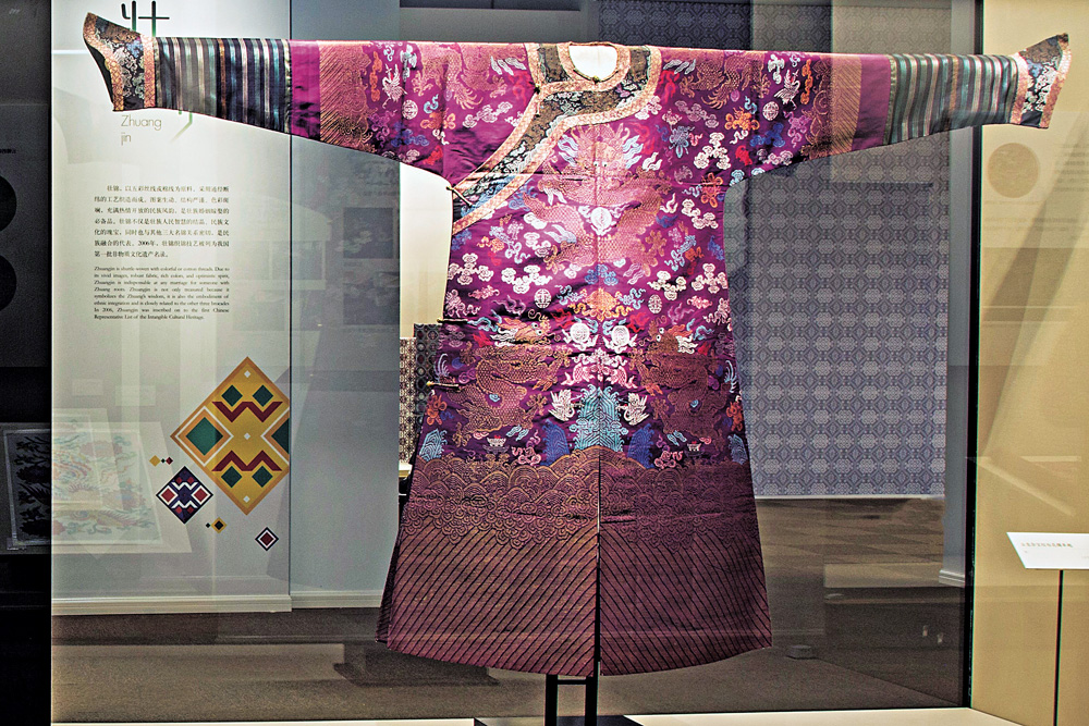 壯錦代表圖案蟒龍紋也在此次展覽上與觀眾見面,該圖案因中大八邊形裏圓點紋組成的紋樣形似蟒蛇皮而得名。在壯族,民間有把蟒蛇當小龍的習慣,並在圖案上表現得極為抽象。該織錦作品還展現了蟒龍在空中釋放雲雷之氣的場景,這是壯族人民對空間宇宙觀的一種表達。
