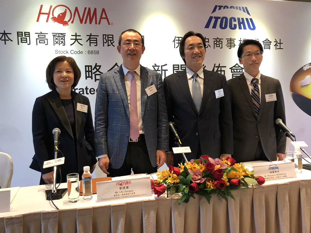 圖:左起:本間高爾夫首席財務官邊蔚文、董事長兼首席執行官劉建國、伊藤忠常務執行董事兼紡織公司副總裁諸藤雅浩、紡織公司品牌市場營銷第1部部長淺沼孝信大公報記者吳涵宇攝