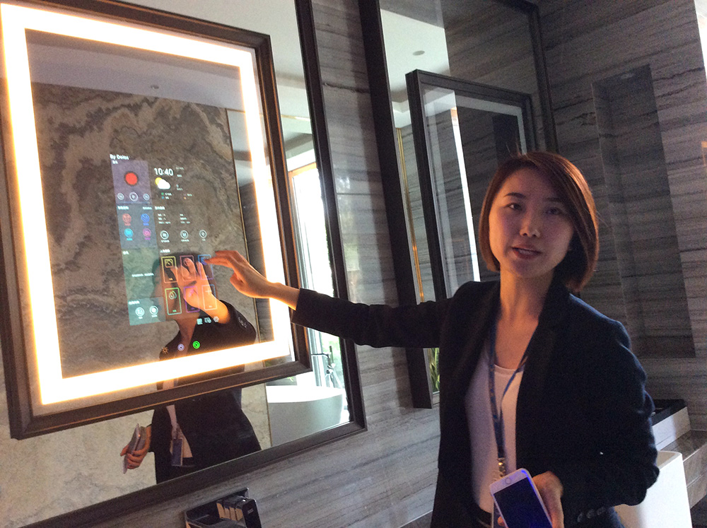 圖:在金螳螂「智慧家居」中,浴室的鏡子就是一個觸模式控制面板,任意調控室內溫濕度、空氣淨化等\大公報記者陳旻攝