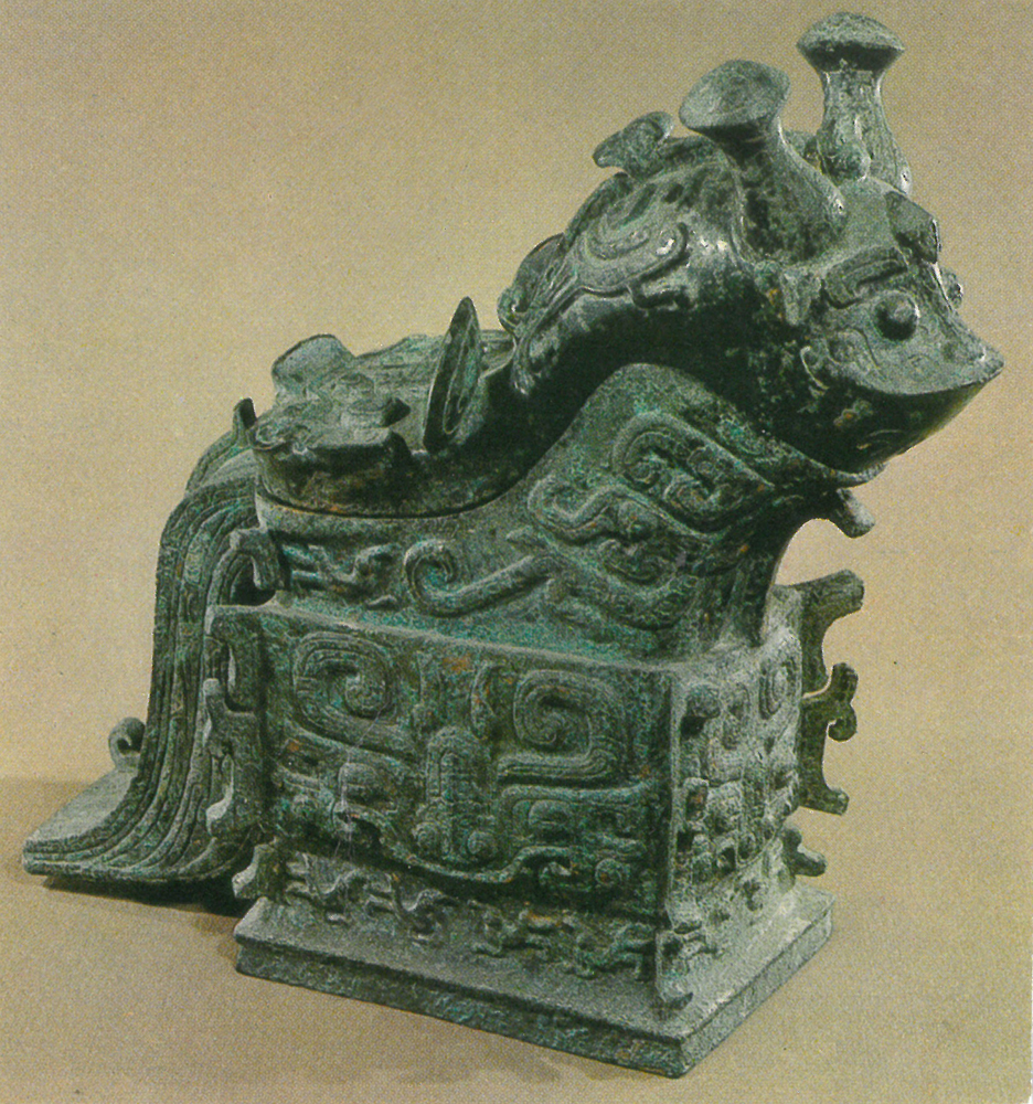 附圖為周代鑄製「日巳」青銅觥,一九七六年陝西扶風出土。推算應為公元前九世紀之器,大概是西周昭王期間;現藏博物館。其造型詭異,紋樣怪誕,好像集多種神獸於一身,布滿碩大饕餮紋,以及一些變化多端的顧首夔紋等。觥體作長方形;觥蓋前端是鼓目怪獸,豎立一雙巨角似長柄菇形,是否傳說中「有首無身、食人未咽、害及其身」的饕餮,難以確定,因屬幻想出來的神獸。一些若斷若續的扉棱,似時隱時現的龍脊;大尾彎長好比鳳鳥。同地出土的觥,造型各異,有如羊頭曲角者、有「鋬」如象鼻或鷙鳥者;但整體視之,宛似蹲伏的怪獸。