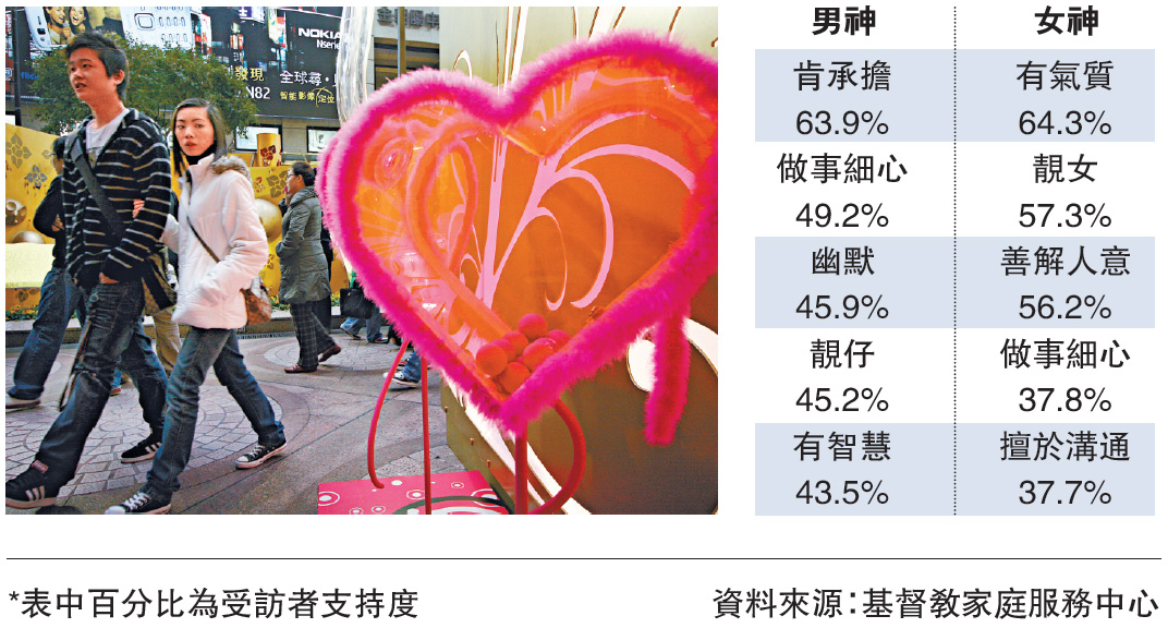 調查指出,辦公室「男神」、「女神」所具備的特質,由16項條件選出五項最高排名。男性心目中的女神,首要是有氣質,佔64.3%,其次是靚女、善解人意、細心及擅於溝通。女性心目中的「男神」,頭三位則是肯承擔、做事細心及幽默,分別有63.9%、49.2%和45.9%,反映女性較追求性格、能力等內在特質。