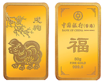 【大公報訊】中銀香港首次推出「中銀香港生肖金牌」。每枚金牌均以50克九九九九千足黃金鑄造,設計糅合了精緻獨特的窗花元素,生動活潑的「戌狗」剪影配合「福」字,象徵福旺、富貴,寄予「戌日耀吉瑞,狗年臻福祥」的美好寓意,極具收藏價值。售價以當時公布的中銀香港九九九九金牌(50克)牌價為準。若參考昨日金價,每枚金牌售價約1.8084萬元。