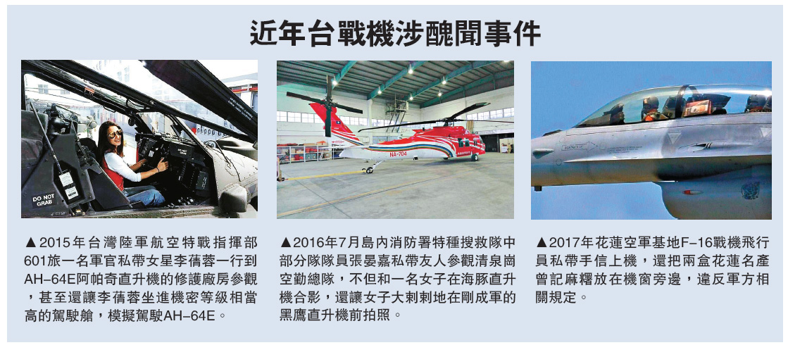 □台軍再爆醜聞。有人爆料「一名辣妹溜進F-16座艙內,還學韓國女團比手勢,嘟嘴向男友喊『啾咪』」。據台媒報道,經過清查發現正是花蓮基地的一架戰機,台軍為此臉都氣綠了,將針對有過失的人員究責。2015年軍官私帶女明星李倩蓉參觀「阿帕奇」戰機的醜聞在島內鬧得沸沸揚揚,但此後這類事件並沒杜絕。2016年又發生消防署特種搜救隊中部分隊隊員私帶友人參觀清泉崗空勤總隊,還讓女友人在剛成軍的黑鷹直升機前拍照。去年又有F-16戰機飛行員利用訓練機會帶手信給教官。