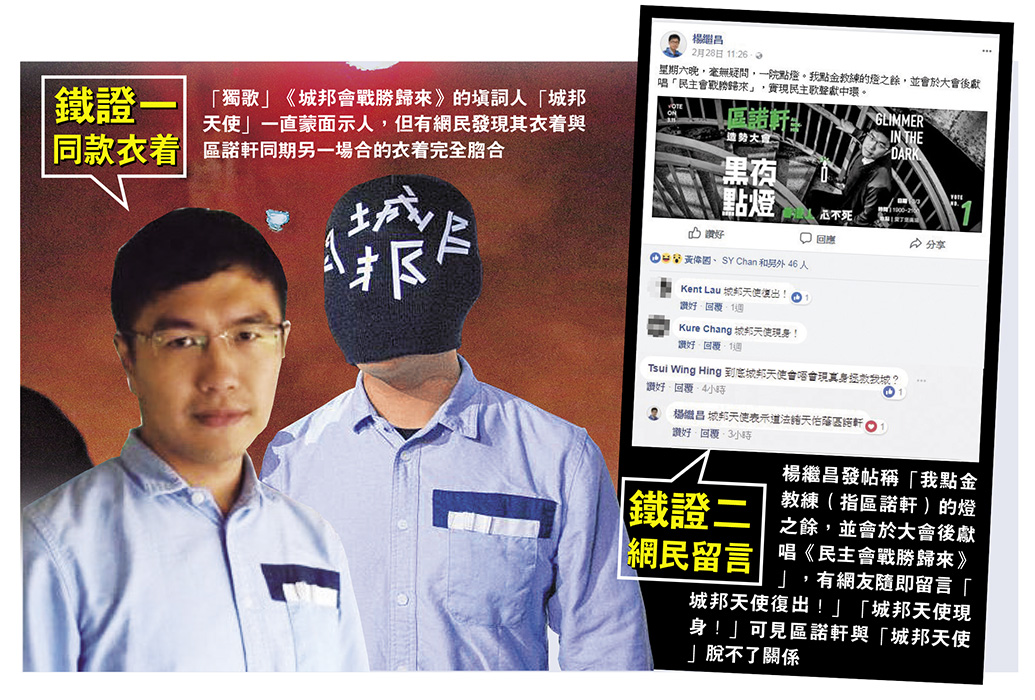 上月28日,區諾軒的造勢大會上,楊繼昌發帖稱「我點金教練(指區諾軒)的燈之餘,並會於大會後獻唱《民主會戰勝歸來》」,有網友隨即留言「城邦天使復出!」「城邦天使現身!」楊繼昌亦回話「城邦天使表示道法諸天護蔭區諾軒」,可見區諾軒、楊繼昌與「城邦天使」三者實脫不了關係。
