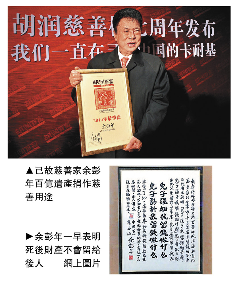 圖:已故慈善家余彭年百億遺產捐作慈善用途