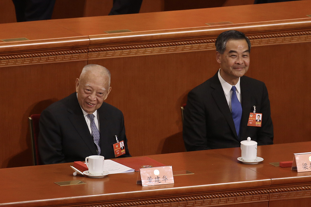 圖:全國政協十三屆一次會議在北京人民大會堂舉行第四次全體會議,選舉政協第十三屆全國委員會主席、副主席、秘書長和常務委員。圖為全國政協副主席董建華(左)、梁振英在主席台上就座/大公報記者何嘉駿攝