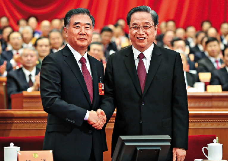 圖:當大會宣布汪洋當選政協第十三屆全國委員會主席後,俞正聲與汪洋熱烈握手/中新社