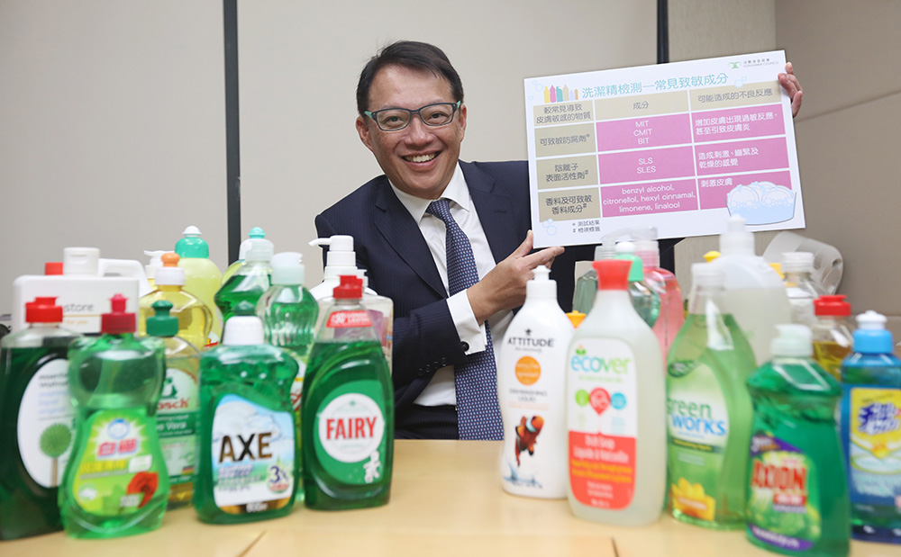 圖:消委會最新報告指出部分標榜「成分天然」、可供清洗蔬果的洗潔精,皆含有可致敏防腐劑,長期接觸可致手部皮膚炎