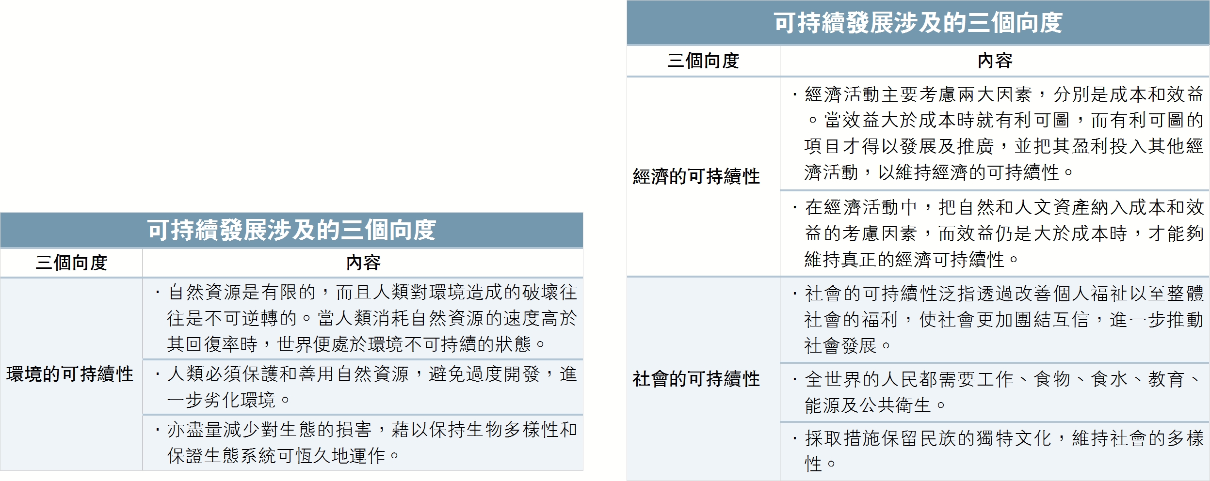 「可持續發展」是本單元的核心概念。溫習時,只要先須弄清它的由來、原則及三個維度,會較容易把握本單元的學習重點。