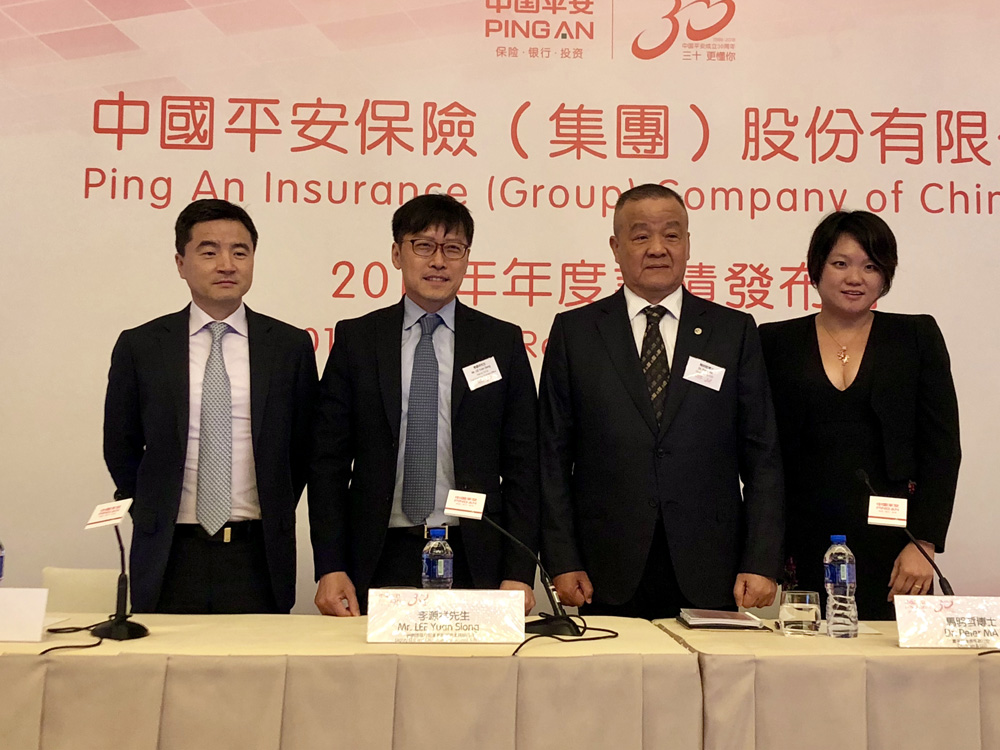 圖:圖左起為中國平安首席財務官兼總精算師姚波、副首席執行官兼首席保險業務執行官李源祥、董事長兼首席執行官馬明哲,以及副首席執行官、首席運營官兼首席資訊執行官陳心穎 大公報記者邵淑芬攝