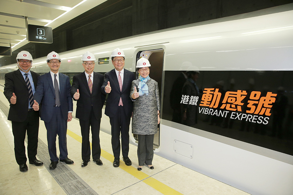 港鐵昨午舉行高鐵香港段主要工程竣工典禮,行政長官林鄭月娥特別在石崗列車停泊處乘坐高鐵列車,八分鐘車程便到達西九龍總站。她於典禮上揭曉,「動感號」(Vibrant Express)是九列高鐵香港段列車的名稱,這是在早前高鐵列車命名比賽逾16,000份作品中脫穎而出,評審認為最能代表香港的名字。