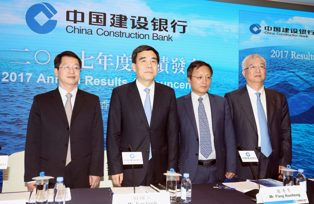 圖:建行管理層在港出席業績發布會。(左起)副行長張立林、董事長田國立、副行長龐秀生、董事會秘書黃志凌 大公報黃洋港攝