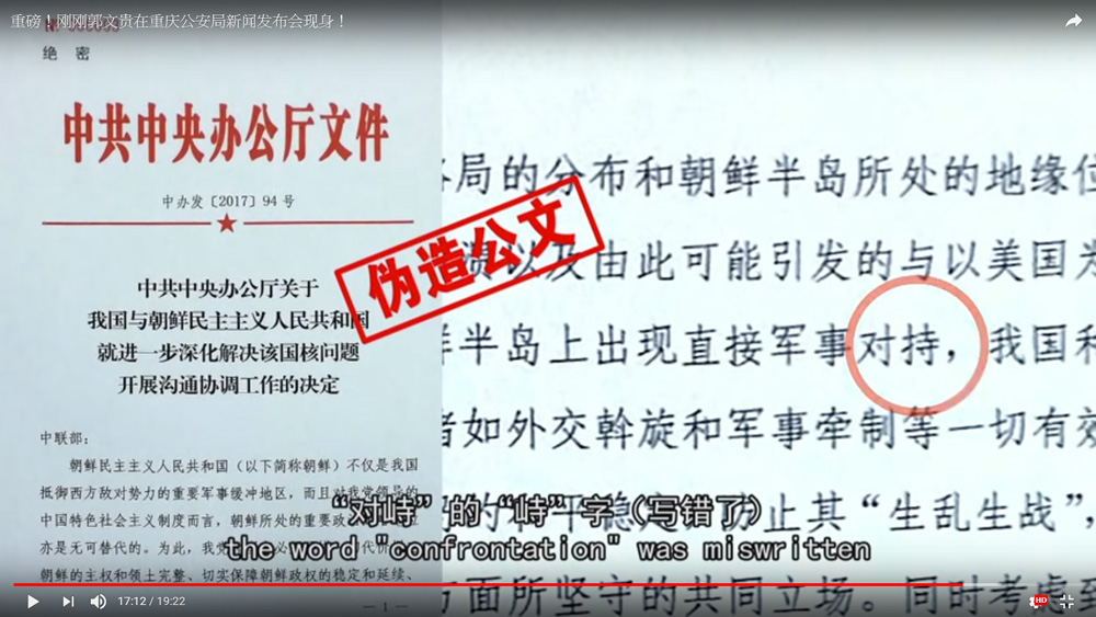 【大公報訊】據新華社報道:雖然陳志煜、陳志恒二人已是絞盡腦汁、頗費苦工,但偽造的文件還是漏洞百出,甚至犯了不少低級錯誤。在其偽造的一份《中共中央辦公廳關於我國與朝鮮民主主義人民共和國就進一步深化解決該國核問題開展溝通協調工作的決定》文件中,把「軍事對峙」寫成「軍事對持」。
