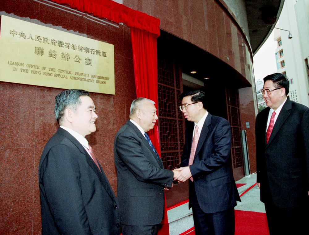 圖:二○○○年一月十八日,時任中聯辦主任姜恩柱(左三)主持跑馬地皇后大道東辦公樓掛牌揭幕儀式,時任行政長官董建華在中午抵達中聯辦表示祝賀