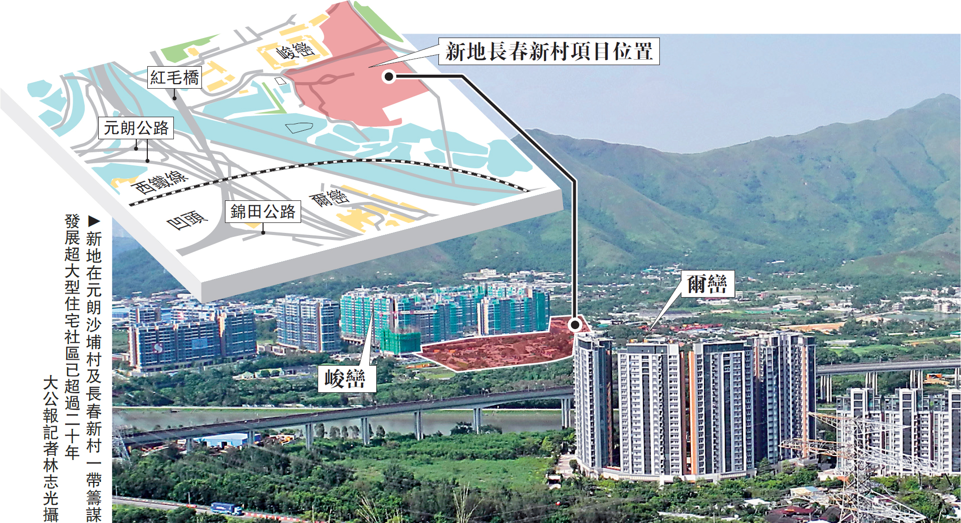 新地在元朗沙埔村及長春新村一帶籌謀發展超大型住宅社區已超過二十年,至2011年開始有成果,沙埔村地皮率先可建樓,佔地逾百萬方呎的長春新村地塊,則屬第二階段發展。