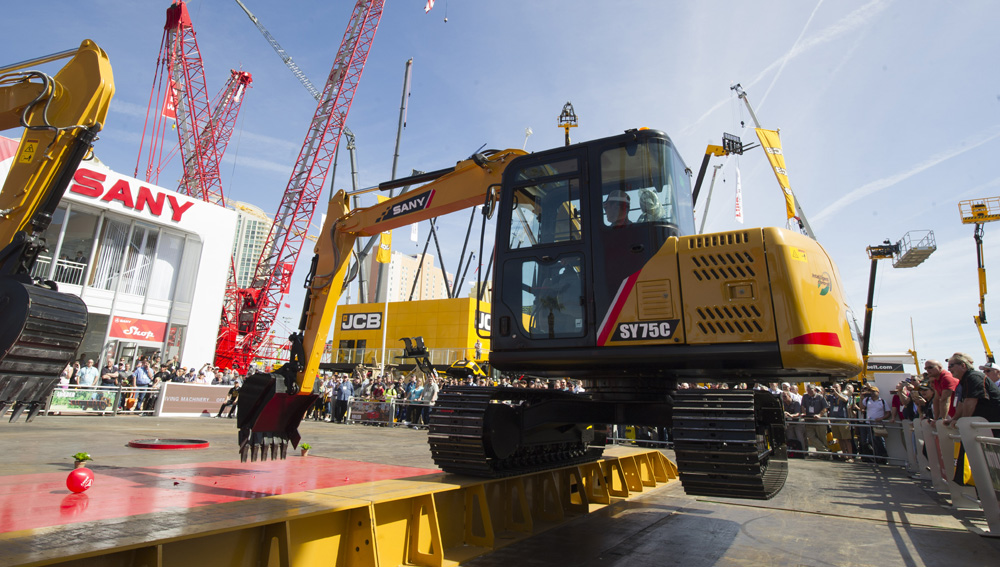 圖:去年美國拉斯維加斯工程機械展,110多家中國整機和零部件企業參展,三一重工挖掘機進行特技表演/資料圖片