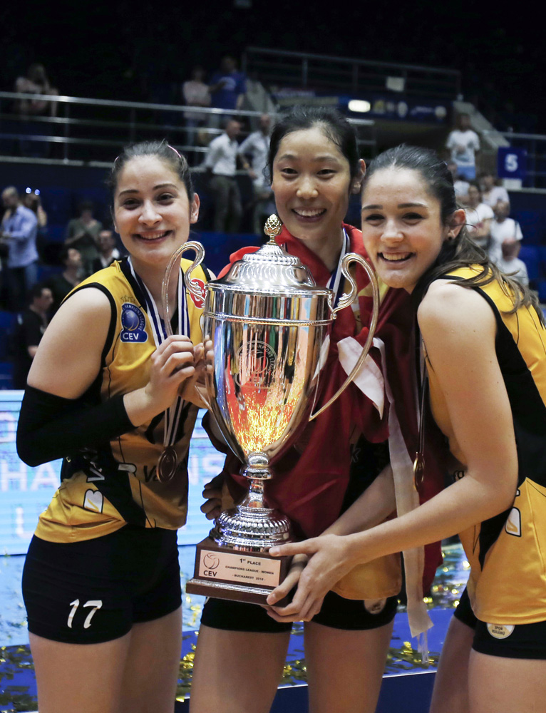 圖:瓦基弗銀行衛冕歐洲女排冠軍聯賽冠軍,圖為朱婷(中)與隊友和獎杯合影\新華社