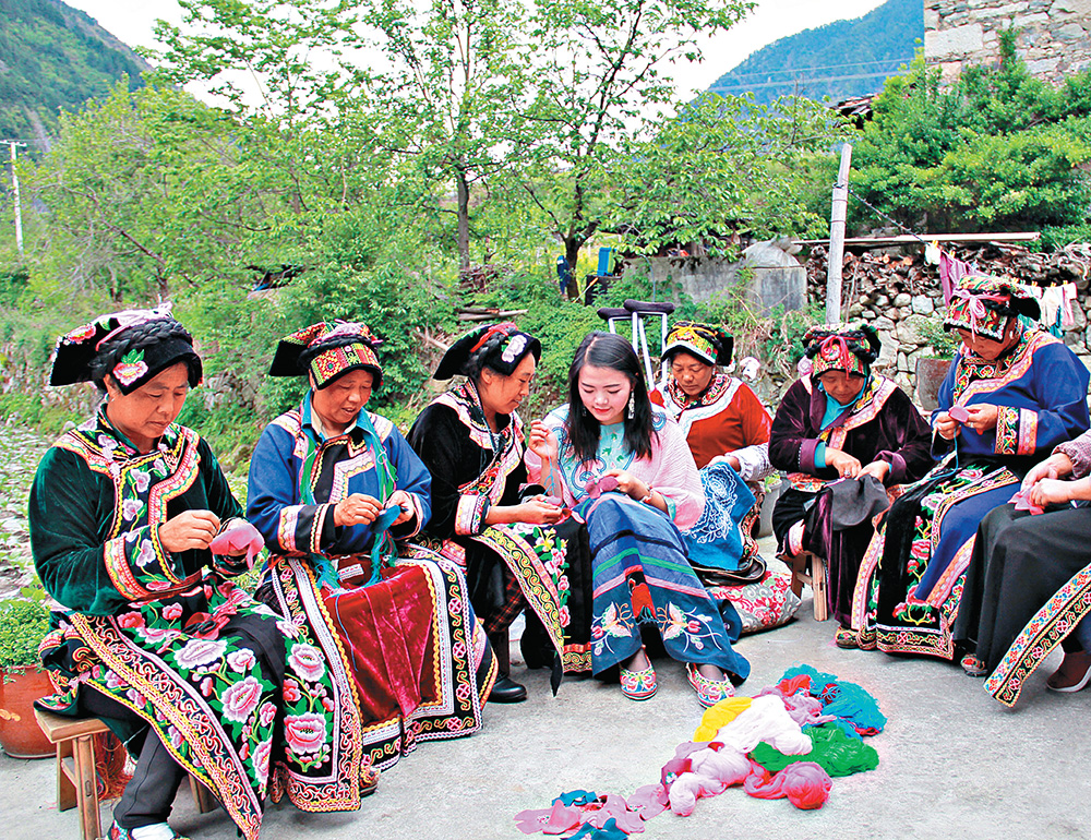 天氣晴好,桃坪羌寨囍悅羌繡館櫥窗裏的羌繡在陽光下閃着亮麗的色彩,90後女孩張居悅此時與小夥伴在館裏陳列貨品、招呼客人,忙得不亦樂乎。作為羌寨裏最年輕的羌繡文化傳承人,她帶着合作社裏60多位繡娘,將傳統的羌繡產品拓展成時尚商品,在傳承羌繡文化的同時,生動詮釋了「生產性保護」對羌繡「活態」傳承的有力推動。