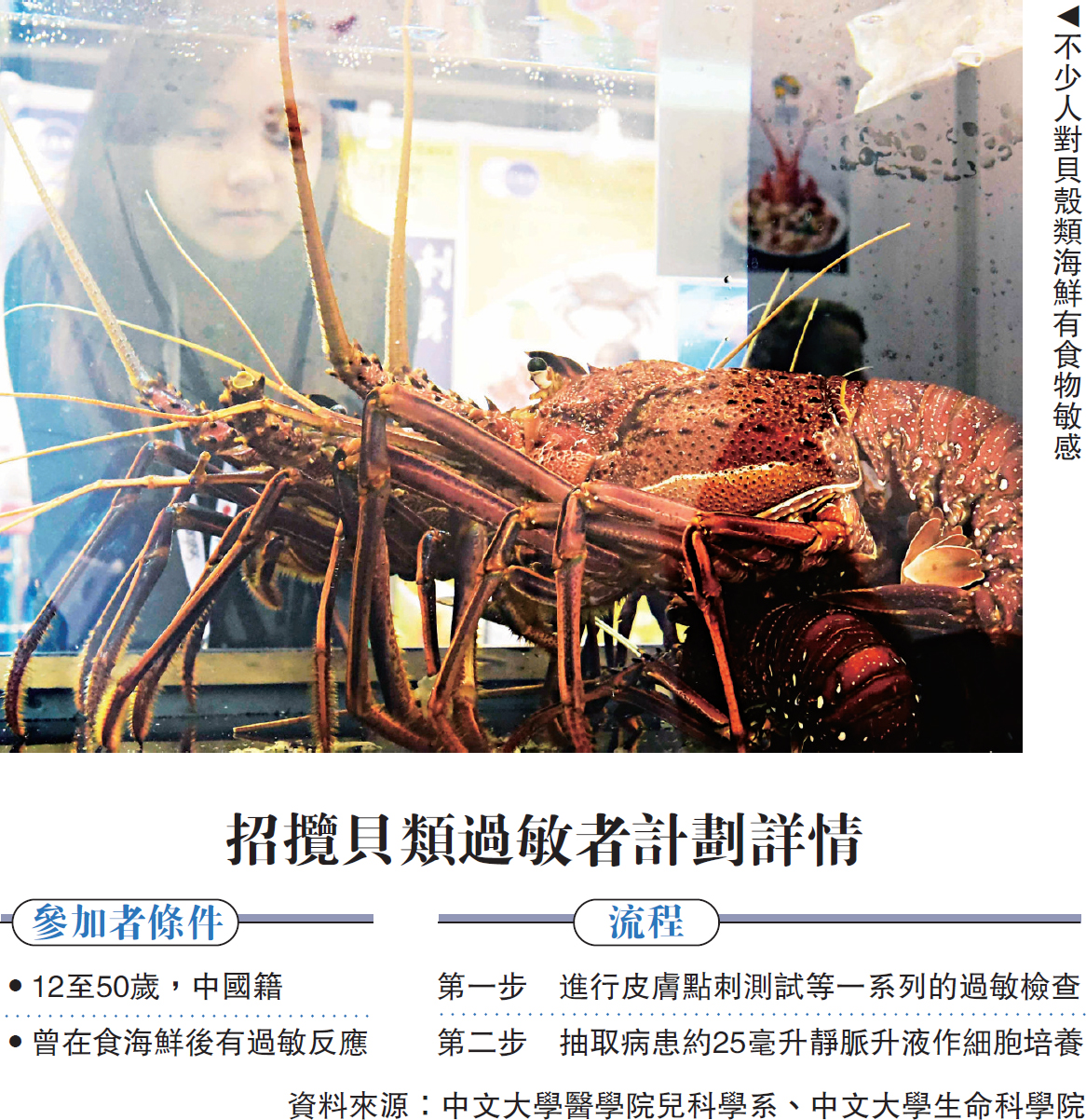 不少人對貝殼類海鮮有食物敏感,有80後女患者便曾因呼吸困難等過敏反應,吃蝦蟹蠔後五次送院搶救。中文大學針對貝類過敏研究免疫療法,研發疫苗一針的防敏效力達六個月至一年,甚至脫敏,讓患者可盡情吃貝類海鮮。小鼠實驗顯示,打三針效力達三周,研究團隊正招攬貝類過敏者,預料兩年後臨床試驗。/大公報記者 楊 州